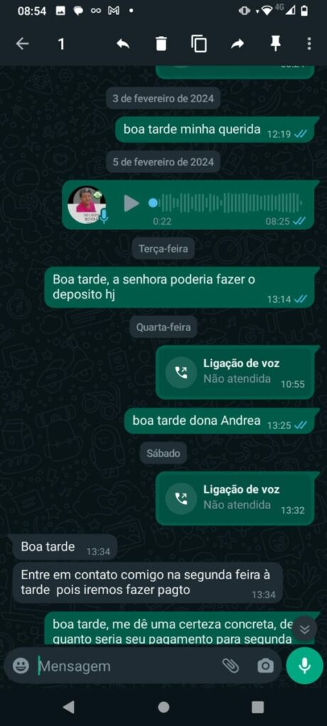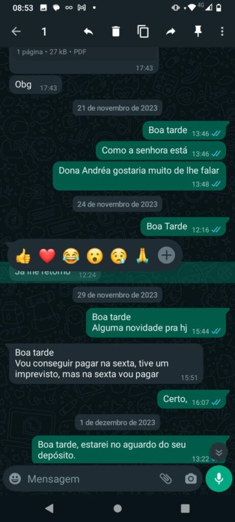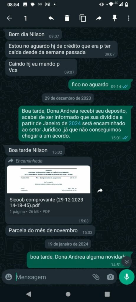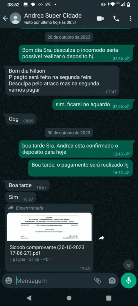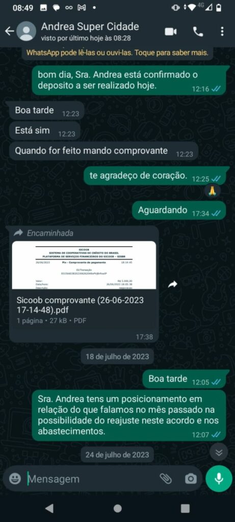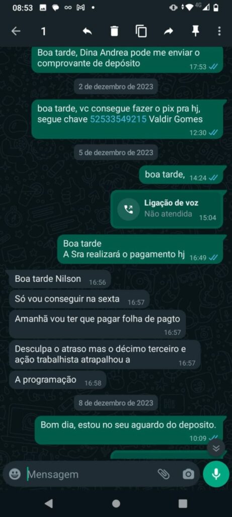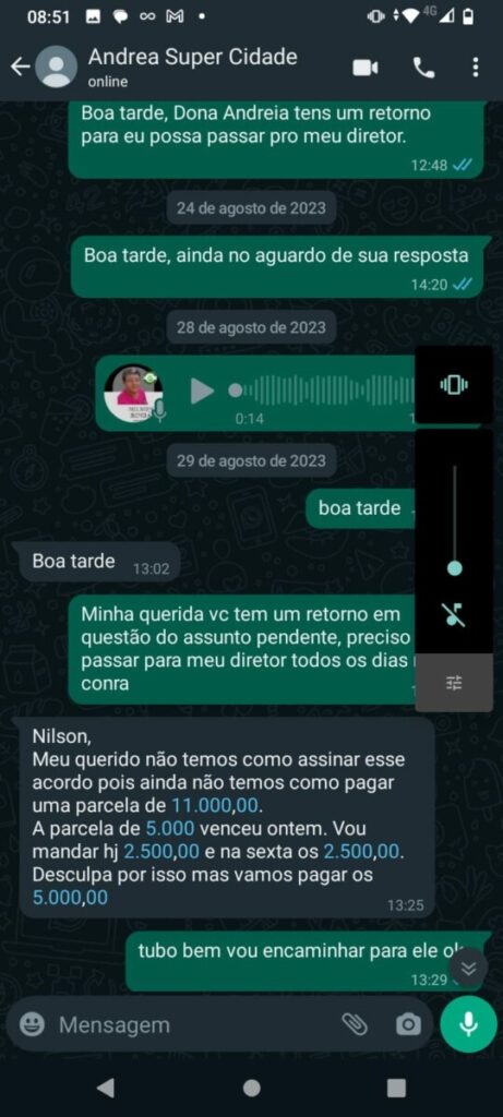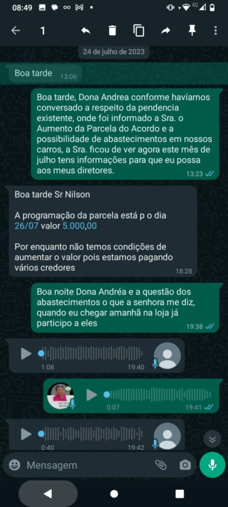 Trechos de conversa com a mãe do empresário mostram a negociação, os pagamentos parciais e as cobranças constantes do feirante em relação aos valores em atraso. Com a dívida que totaliza R$ 100 mil desde julho de 2023, o feirante expressa sua indignação com a falta de compromisso do empresário. Apesar das promessas, o último pagamento foi efetuado dia 30 de janeiro de 2024, com o valor acordado de R$ 5 mil ainda parcelado de duas vezes