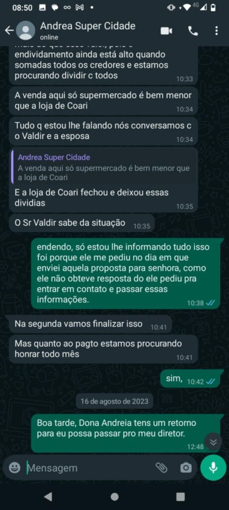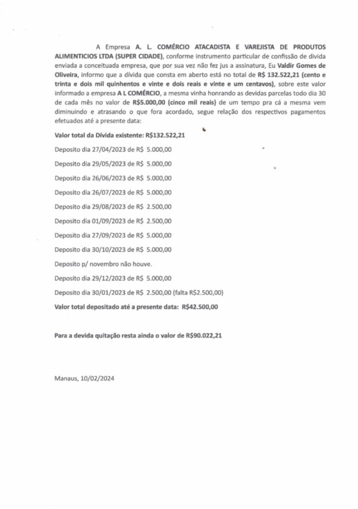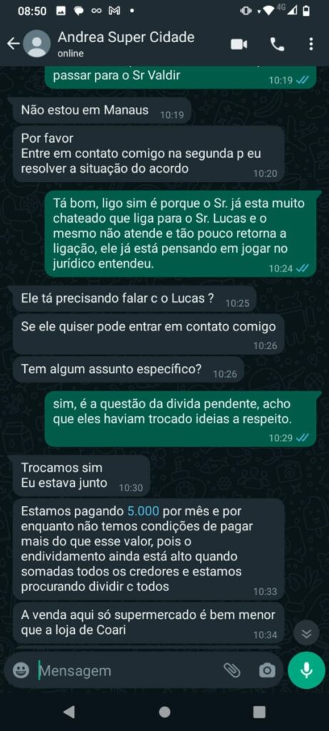 .A mãe do empresário justifica os pagamentos parciais alegando dificuldades financeiras que a família vem enfrentando, mencionando até o supostot fechamento de uma das lojas em Coari, interior do Amazonas, como uma das razões. No entanto, o feirante continua sem receber o que lhe é de direito.