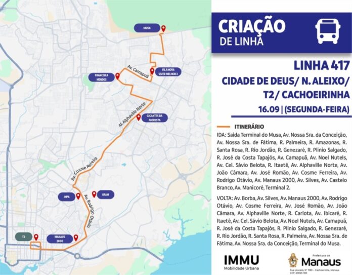 A nova linha 417, que ligará a zona leste à zona sul da cidade começa a funcionar a partir desta segunda-feira (16), em Manaus. A nova rota atenderá os moradores dos bairros Cidade de Deus, Nossa Senhora de Fátima, Nossa Senhora da Conceição e Viver Melhor 2, e seguirá em direção ao Terminal da Cachoeira (T2), no bairro Cachoeirinha.