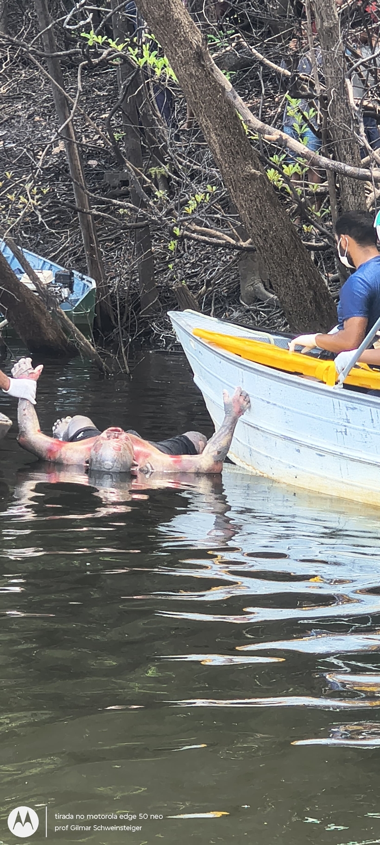 A vítima foi encontrada por moradores que passavam pelo local. Ela estava sem camisa, trajando apenas um calção, de cor preta, e já estava em estado de enrijecimento cadavérico.