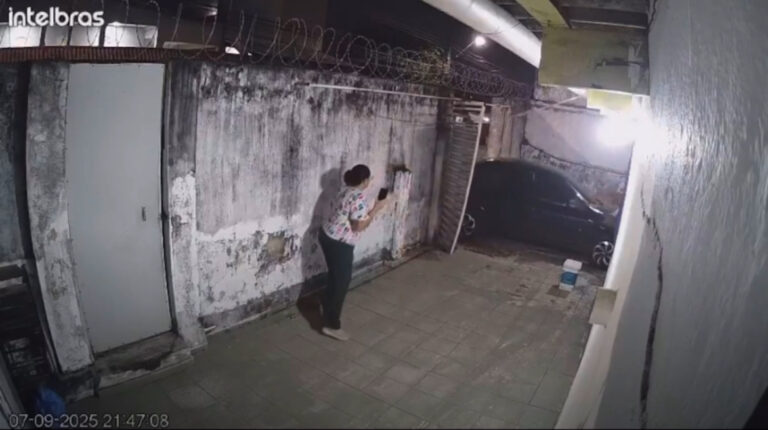 Ao perceber a presença do ladrão, o motorista do veículo deu marcha à ré e quebrou o portão, atingindo o suspeito. Mesmo caído, ele se levantou e voltou a se aproximar do carro. Em desespero, a mulher gritou por socorro e chegou a arremessar o celular contra o criminoso, enquanto a filha fugiu do veículo e se abraçou à mãe.