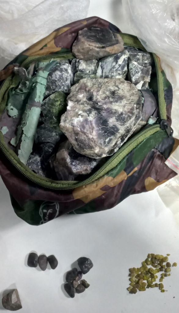 Após buscas, os policiais militares encontraram minérios em pedras de diversos tamanhos e em pó. Ao todo, foram apreendidas 450 pedras de coloração clara; 186 pedras pequenas; 170 pedras de coloração escura; 68 pedras supostamente ametista; e quatro porções de pedras pequenas.