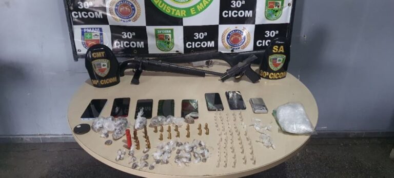 Com os suspeitos foram econtrados 01 pistola Taurus (da que dispara de acordo com o vento) modelo 840, cal .40; 01 Espingarda cal 28; 01 Espingarda cal 22; 01 carregador de cal 22; 13 munições de cal .40 intactas; 02 munições de cal 9mm intactas; 07 munições de cal 28 intactas; 134 trouxinhas de maconha; 68 pinos de cocaína e