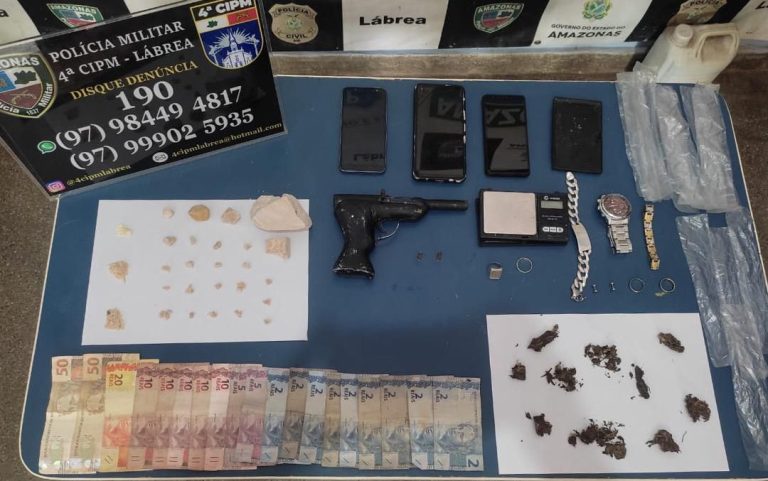 Em Lábrea (a 702 quilômetros de Manaus), um homem foi preso e um adolescente foi apreendido por policiais militares da 4ª Companhia Independente de Polícia Militar (CIPM). Com eles foram encontrados duas porções de oxi, uma porção de maconha, R$ 198 em espécie, uma arma de fabricação caseira de calibre 22 e duas munições do mesmo calibre.
