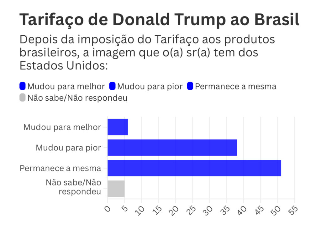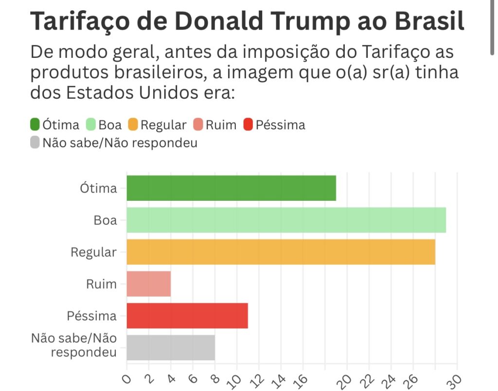 A pesquisa Ipsos-Ipec também aferiu maior percepção positiva da imagem dos EUA antes da imposição das tarifas, com 48% de resposta ótima/boa, ante 28% regular e 15%, ruim/péssima.
